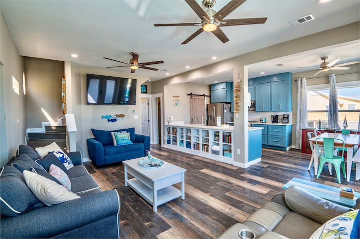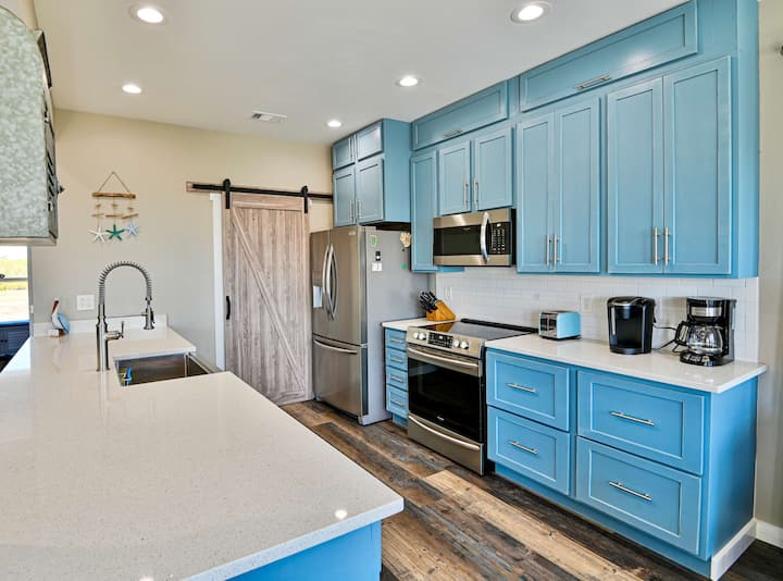 Step into the airy kitchen, adorned with beautiful blue cabinetry and stone countertops, just past the ample cabinet storage filled with movies, books, and board games for delightful family game nights. Equipped with stainless steel appliances, including a blender and a coffee maker, brewing the perfect pick-me-up is a breeze. The open layout seamlessly connects the kitchen to the dining area, boasting a spacious table that comfortably seats 6. Enjoy fantastic kitchen amenities while savoring delicious meals with friends and family amidst the coastal ambiance.