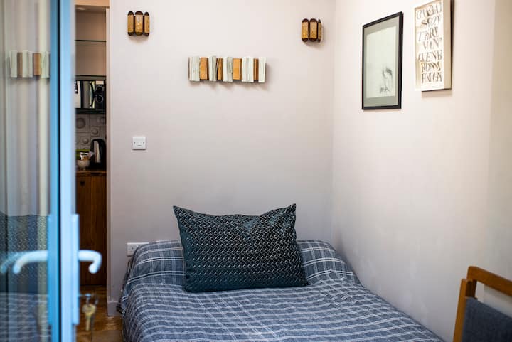 The Gallery room is a very cute, bijoux space. It’s not huge! But very cosy and perfectly suited to a single person or a couple who don't need a lot of space. As the name suggests, it is a white, modern room furnished with a mix of new and vintage fixtures and fittings and a new double futon bed. The en suite bathroom is tiled with my bamboo tile designs. There is a private terrace with a table and chairs outside of the conservatory area and a private entrance from the side street.