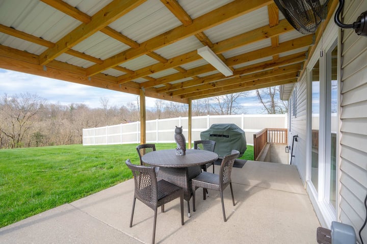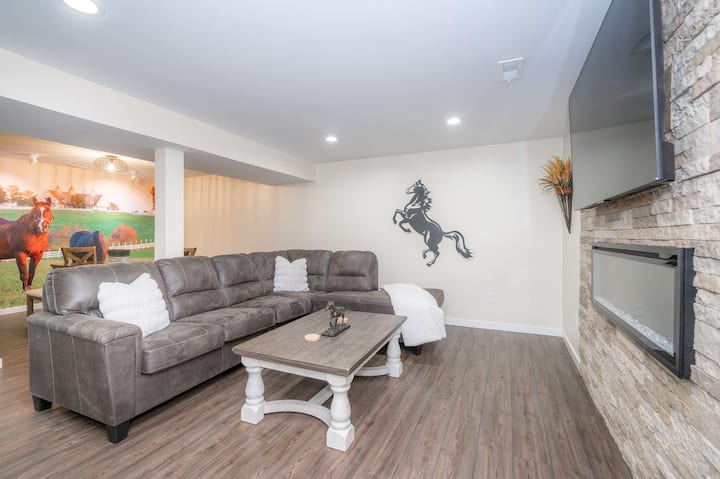 The home’s spacious interior gives a nod to the vast countryside that surrounds it along with the horses that inhabit it, with charming equestrian accents in each room’s décor. Unwind at the end of fulfilling days in the living room on plush sofa seating while you binge watch episodes of your favorite shows on the smart TV. A dedicated workspace is also available here on the off chance you need to check a few emails or take a couple of calls while away. The well-equipped kitchen has everything you need to whip up convenient meals right at home, with plentiful counterspace and cabinetry for meal preparation and storage. Grab a stool at either of the high-top tables for a quick bite or casual breakfast or head to the lower level where you’ll find a formal dining table with seating for 6. This area also offers a second living room with L-shaped sofa seating, a smart TV, and an accent fireplace to keep you warm and toasty during the cooler months. If you prefer to spend as much time outdoors as possible, the back patio has you covered with options for dining, grilling, and spending an evening by the fire.