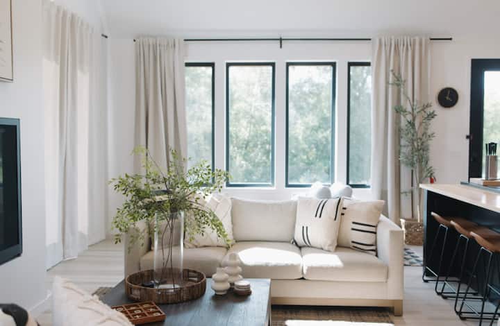 A gorgeous, bright white, crisp and clean design. It is connected, but completely separate from the Main Haüs and is fully stocked with everything you will need during your stay. The main floor has a beautiful galley kitchen w/ living combined. Includes a gorgeous marble and brass table, leather sofa, soft velvet chairs, modern gas fireplace and Frame TV.