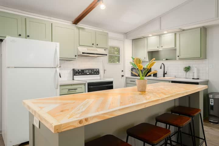 Open great room for gatherings around the kitchen island. Firepit, cafe lights & spacious patio out back. Kids will love the bunk room, bonus room with projector & foosball table, basketball game, corn hole & exploring the woods.