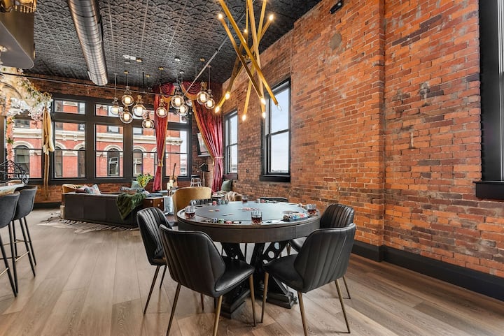 This single-level penthouse loft opens into a spacious, open-concept living area designed for time together. Plush seating invites you to settle in while games unfold at the poker and shuffleboard tables. A separate bar area anchors the room, paired with a 65-inch TV and sound system for shared viewing or background music. An elevated corner stage sets the tone for karaoke nights, whether you’re stepping up to the mic or cheering from the sidelines. Large windows frame city skyline and river views, keeping the downtown energy present throughout the space.