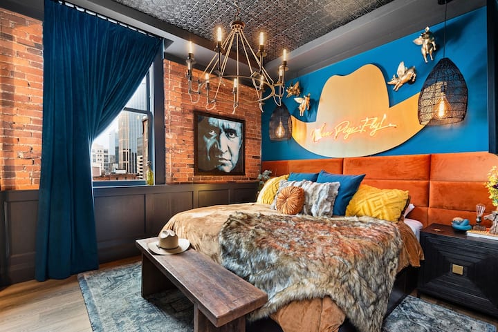 Located on 2nd Avenue in the Historic District, the loft places you within walking distance of Printer’s Alley, Broadway, and nearby dining, music venues, and galleries. Nissan Stadium is visible from the windows and easily reached on foot across the bridge.