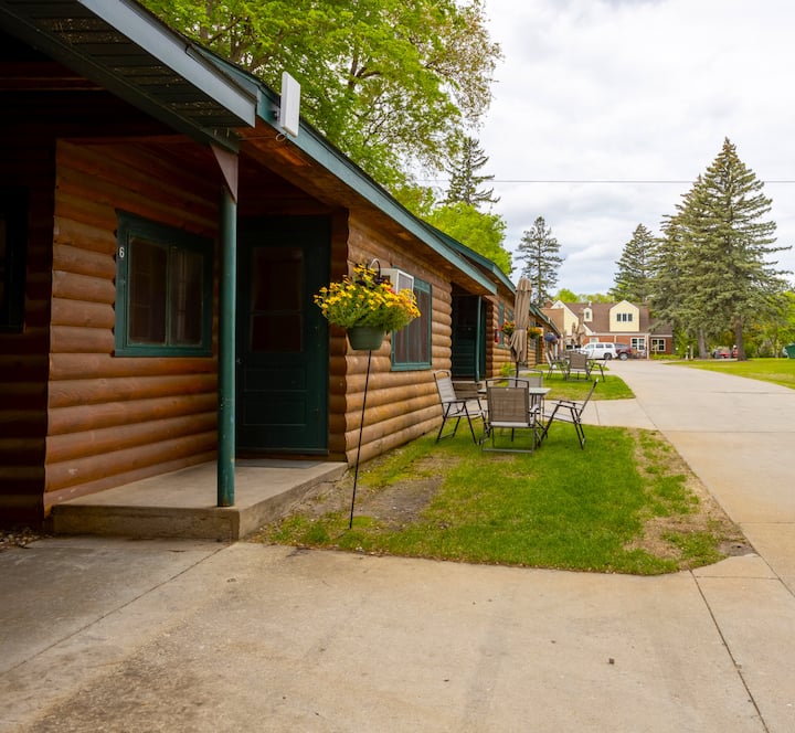 Step inside Cabin #6 and settle into a warm, inviting space designed for comfort and relaxation. The living room offers cozy seating, a double futon, and an electric fireplace/heater that adds classic cabin ambiance—perfect for unwinding after a day on the river, exploring Itasca State Park and the Mississippi Headwaters or shopping around town.