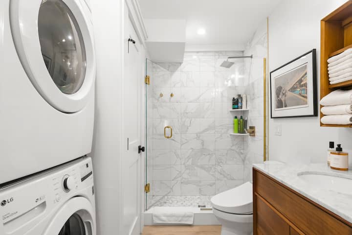 Enjoy modern comfort and convenience with a stylish tiled shower, ample storage, luxurious fixtures, in-unit washer and dryer, garment steamer, blow dryer, and curling iron, all designed to enhance your stay with comfort and functionality.