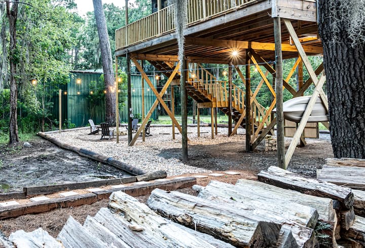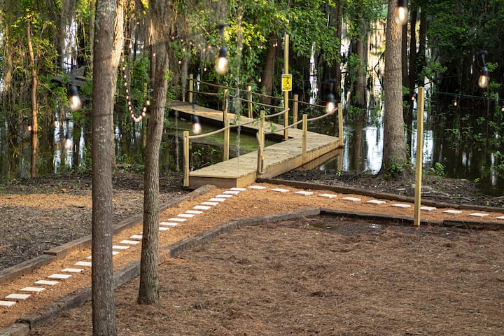 The Retreat at Jackson Arms Hideout is just the sort of break you deserve. It's a super nice, cozy two bedroom cabin specifically intended for an undisturbed break from reality. As mentioned earlier, your journey starts when you book. However the real journey starts on your drive in. Excitement fills you as you get in the car to leave. A drive full of positive anticipation thinking of the magical memories you'll make. As you get close, you will feel as if you are going nowhere. Each turn feels like more nowhere than the nowhere before. Finally a curve opens up to a small hill that leads to an ancient cross tie bridge over a canal just off the Big Cypress Bayou. Thump thump thump as you slowly roll over. It's alot to take in the first time (in a good way). Your first thought being: "Will this bridge hold my car?" (Yes it will actually hold like 15 tons) That quickly turns into: "Wow, how have I never experienced this?!" Coming down the bridge, there are houses on each side of the road. Most on piers. Pine trees, oak trees and the magnificent cypress trees everywhere. The draping spanish moss on a curved road creates a feeling of teleporting to a new world. It's like stepping into the wardrobe and ending up in Narnia. The transformation feels rapid. But everything about this place feels far from rapid. It feels slow. Intentional. Tranquil. Meaningful. This is Caddo. A few back roads and bumps later, you pull up to The Retreat at Jackson Arms Hideout