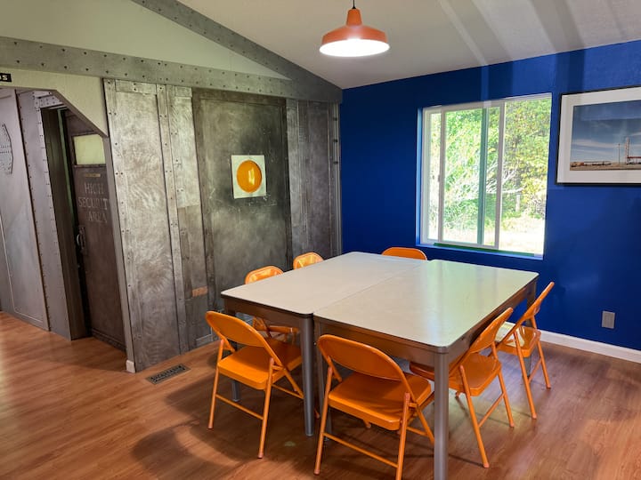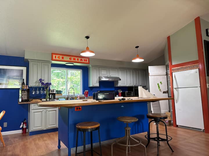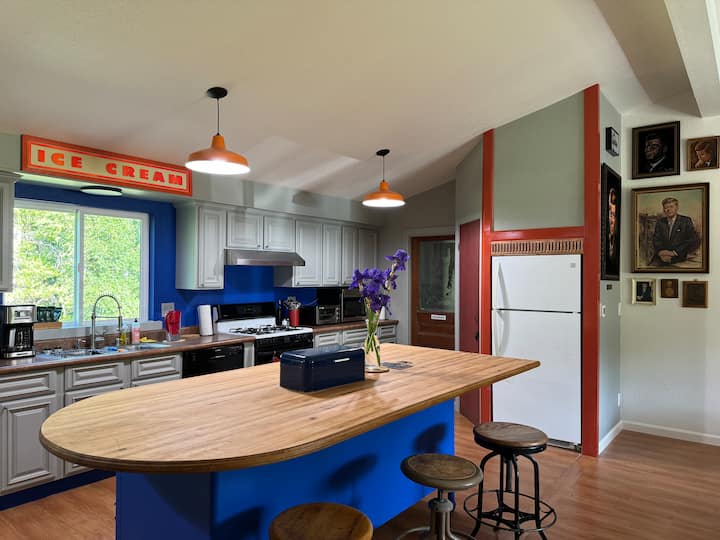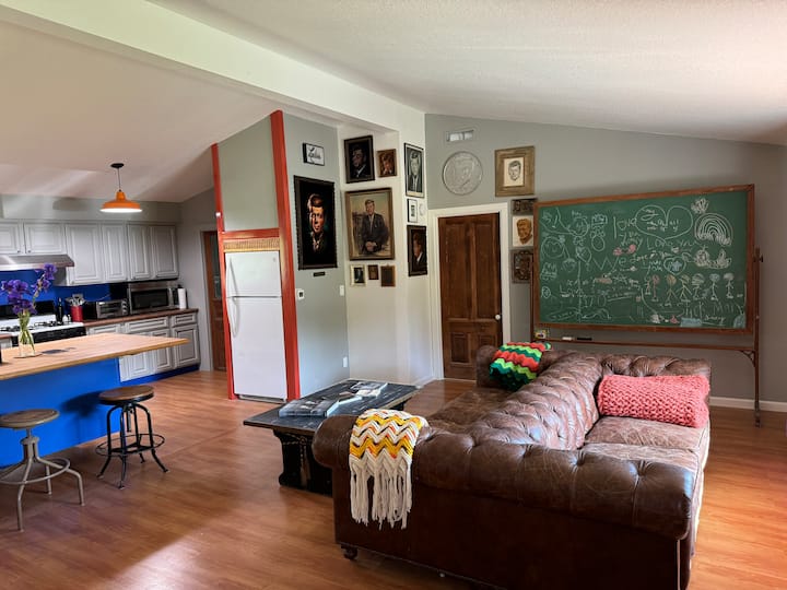 The Schoolhouse has a double sided couch (so fun!), mid century furniture and antiques, vintage math charts on the wall, a giant antique school chalkboard ready for you or your kids to draw on, and lots of quirky touches and cool artwork. The wifi is really robust. There is a 50" TV mounted in the living room.