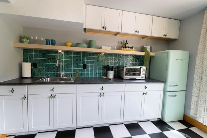 - Mid-size fridge/freezer, coffee maker, tea kettle
