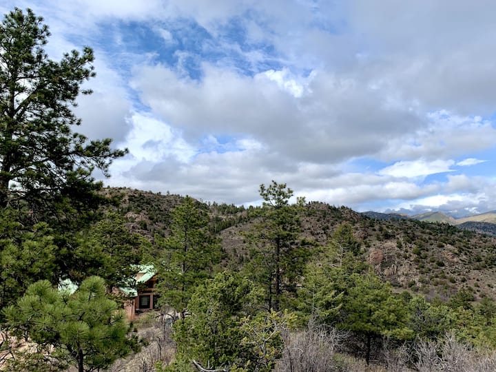 Winter mountain escape with private snowshoe trails, rescued mustangs & Pikes Peak views. 30 min to Mueller State Park's 90+ miles of winter trails. Cozy suite sleeps 4, full kitchen, 64 acres to explore.