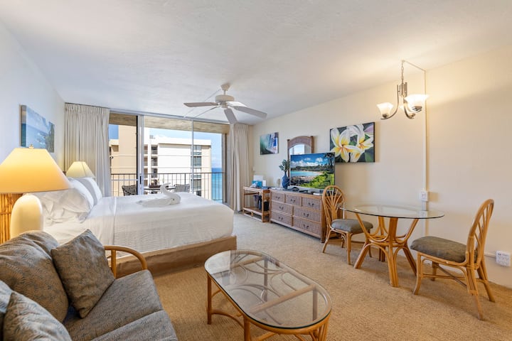 Welcome to Royal Kahana 1019. This 10th floor studio offers a partial ocean view. This unit is tastefully appointed with classic Hawaiian decor. The studio features a king size bed.. Keep cool year round with central AC & ceiling fans throughout. Enjoy beautiful views from your private lanai. The resort offers many amenities and located in a great area close to food truck park, farmers market, shops, & dining. Make amazing memories at RK 1019!
