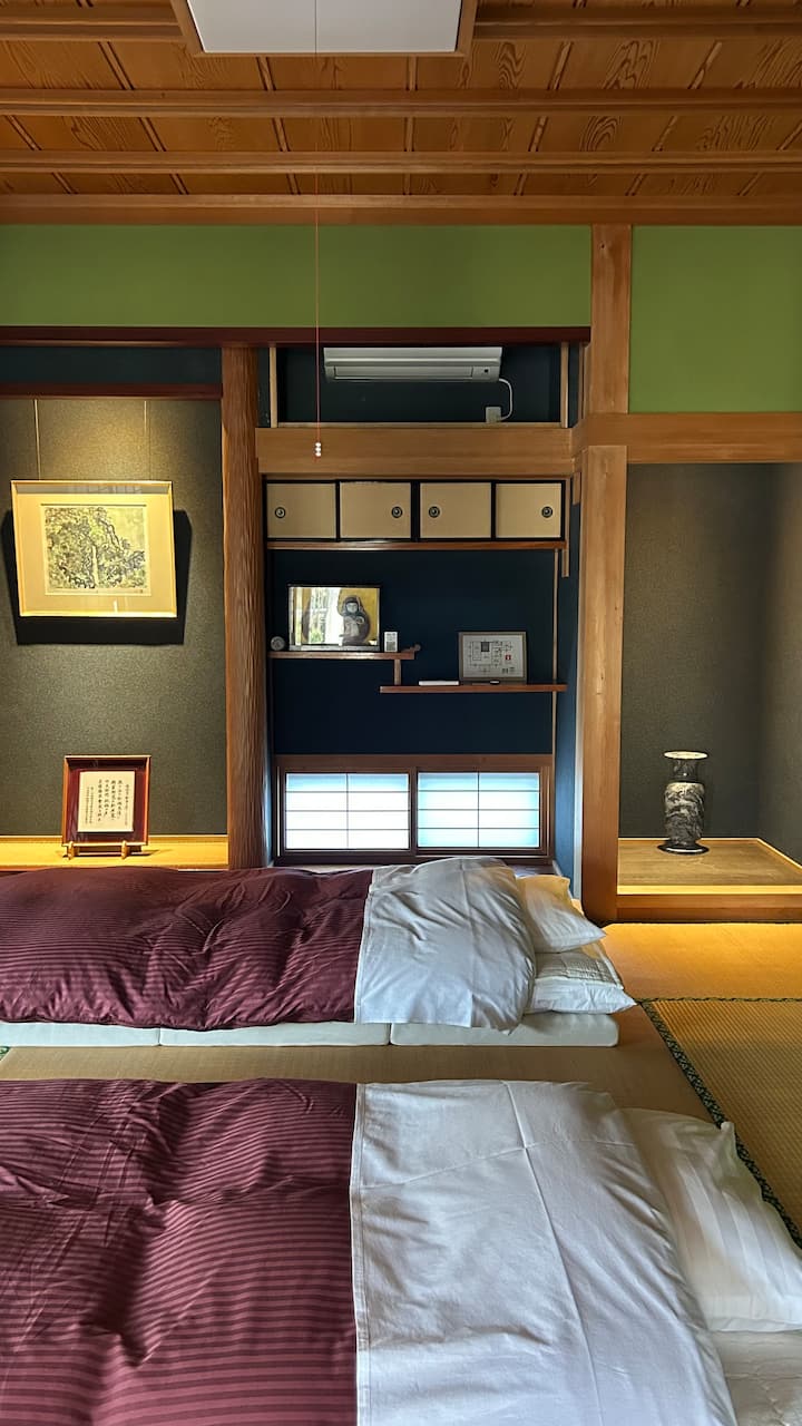 Traditional Japanese Samurai style mansion (2,000 sqf) with Three spacious 8 Tatami size air conditioned guest rooms ( total 470 sqf) with Futon. Entrance hall with cozy wood stove, full kitchen and dining, shower with Japanese deep tub, renovated modern toilet.