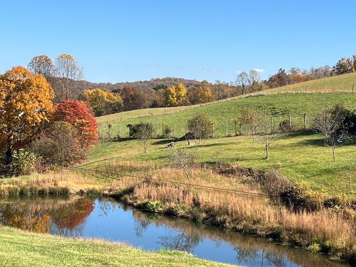 The Zion Heritage Memorial Orchard behind the "Liberty" tiny farmhouse is dedicated to the West Virginian service men and women who died in combat in Iraq and Afghanistan since 9/11. A granite memorial bench at the top of this orchard overlooks the entire farm. It is a beautiful spot for reflection.