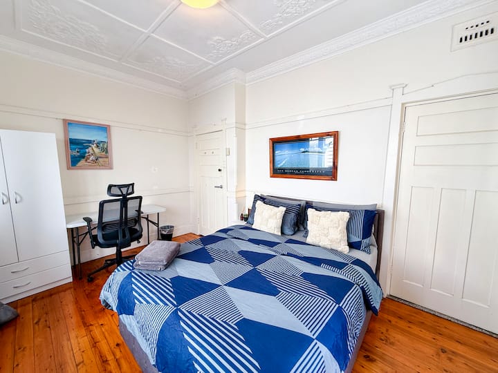 Comfort and convenience await you at Balmoral Beach House, just 5 minutes walk from Balmoral Beach, the largest flat water beach in Sydney. Our spacious Alexis Room features a queen bed and is next to the kitchen. Ideal for younger guests or those who don’t mind occasional kitchen bustle. Easy transport options nearby let you explore Sydney’s attractions. Take a ferry to the city to enjoy the best of Sydney. Experience the charm of Balmoral Beach House.