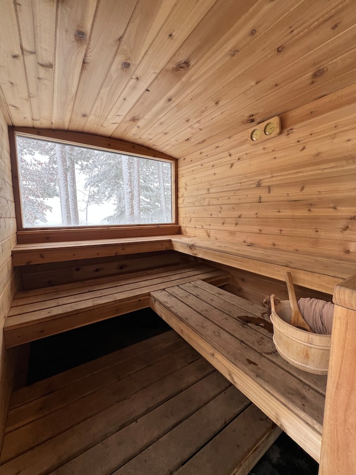A guest favorite is the wood burning sauna built by Embrace North. No matter the season, but especially when there is a chill in the air, relax and unwind in the outdoor Kuuma stove sauna with a large window overlooking nature.