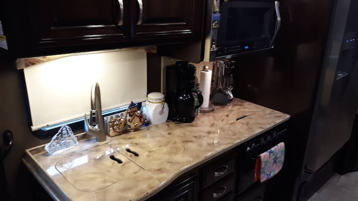 The RV has a well-stocked kitchen with contemporary amenities, allowing you to prepare any meal that comes to your mind.