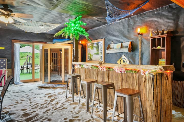★ The basement of the barn is equipped with an indoor beach room filled with sand, beach swings, a tiki bar, and an infrared sauna.