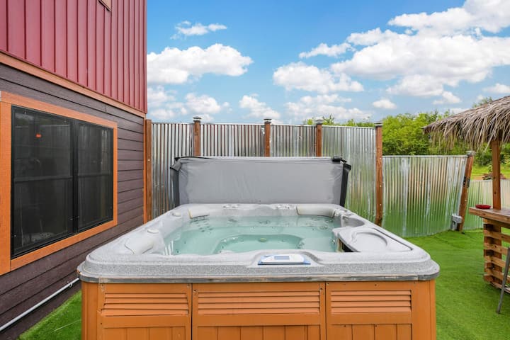 ★ The outdoor patio in the backyard is LOADED with amenities that will keep your group entertained for days. Walking out from the basement, you will find a turf area with a custom designed Tiki Bar, 8 Person Hot Tub, Outdoor Shower, Patio Swings, Firepit, Full Sized Sand Volleyball Court, and a Frisbee Golf/Frolf course with chains and discs.