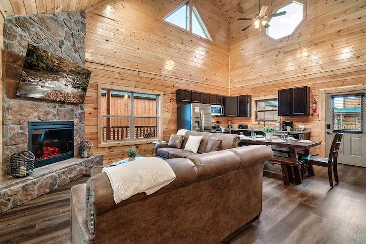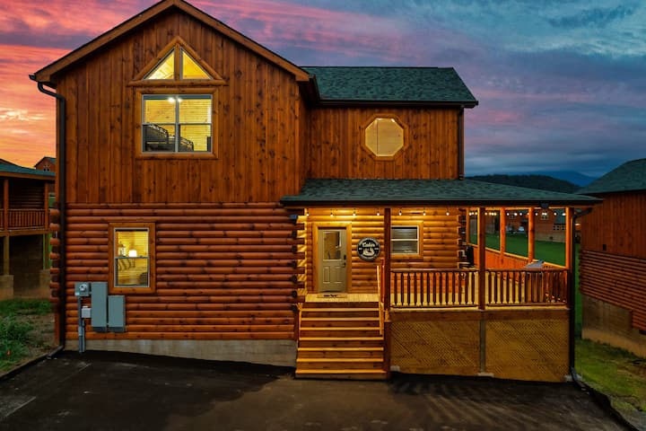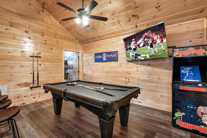 INDOOR HEATED SWIMMING POOL cabin that is ONE minute from the Pigeon Forge parkway and centrally located to all the attractions in Gatlinburg, Pigeon Forge, & the Smoky Mountains! This beautiful new cabin sleeps up to 12 people with 4 en- suite bedrooms. This cabin is the perfect base to explore the Smokies! It's close to local attractions and offers several of its own - indoor pool, pool table and multi-cade, outdoor grill, and streaming smart TVs.