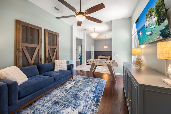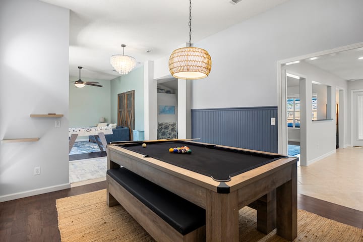 This spacious home features a massive 18x36 screened-in pool, pool table, foosball, high speed WiFi, outdoor and indoor games that guests consistently rave about.