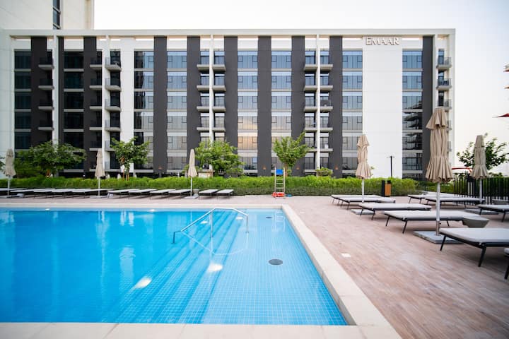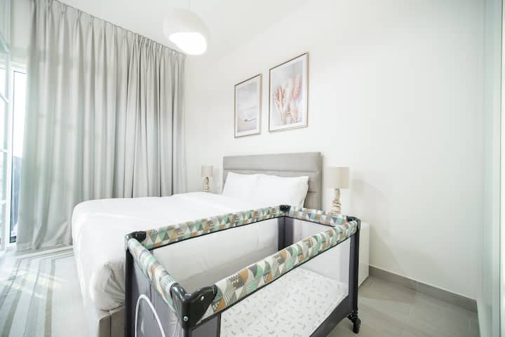 This peaceful 1BR in Golfville, Dubai Hills is baby-ready, spotless, and set in a quiet, family-friendly neighborhood.
