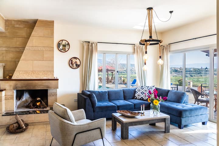 Villa Demetra offers panoramic views across the bay and beyond the Baths of Aphrodite, the Akamas Peninsula, Latsi, and also across the rolling countryside and hills. This villa is extremely spacious with a private good sized infinity edge swimming-pool, attractive terraces and balconies, and an excellent standard of accommodation inside, well-appointed rooms and attractive furnishings. This magnificent house is ideal for families, large groups of people or couples who are looking for a smart, stylish and deluxe villa in a quiet area. The villa is about 300 sqm.