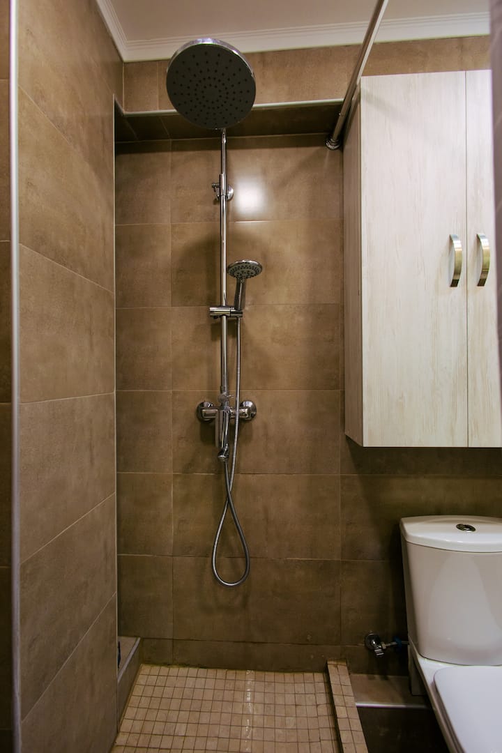 The bathroom includes all the essentials: a shower set with good pressure, a nice shower head, a mirror, and a vanity unit. The clean tiling ensures a fresh, modern look.