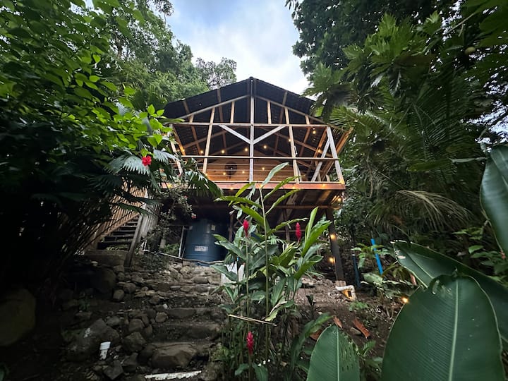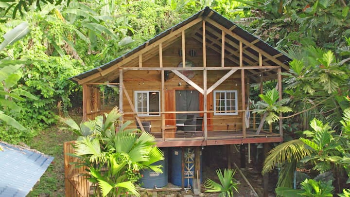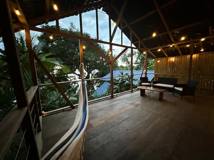 70' up in the jungle canopy among the treetops...A private and totally unique rustic Jungle Cabin. Casa Serenity By The Sea: Tree Frog House is a Studio Loft layout Cabina with 320 sq ft of space on the lower level and 224 sq ft of space in the upper level. It has a King size bed upstairs and a Twin size Daybed in the Living Room. There is hammock, hammock chair, and a Ratan loveseat/chairs set with a coffee table on the deck. Air Conditioning and powerful fans installed inside and outside