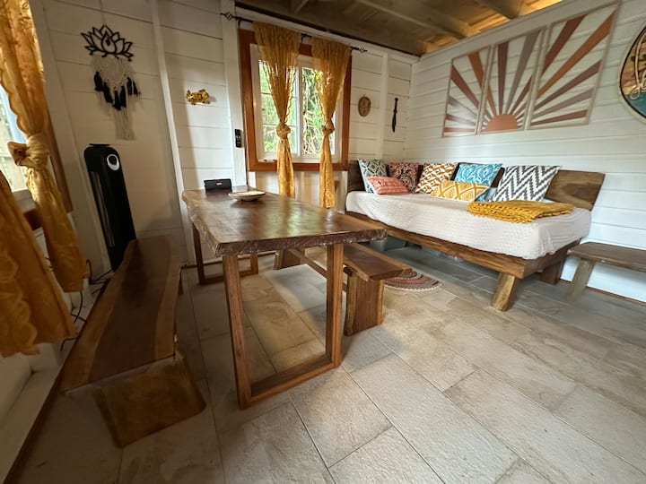A full kitchen is available for cooking meals with options for electrical or gas powered. Tea kettle and French Press are available for making coffee. Dimmable lighting has been installed inside and out for ambiance. The mattresses are 12" cooling gel memory foam accompanied by down pillows and 100% Bamboo linens. There is a table and bench system for dining. There is also a Ratan loveseat/chairs set and a coffee table on the deck.The beautiful furniture is made from repurposed Nispero and locally grown/hand-hewn Black Laurel wood. Go for a surf and get barreled in crystal clear water. Re-align yourself with nature in this very special place. Everything you really need is either right in front of you or a short boat ride away.