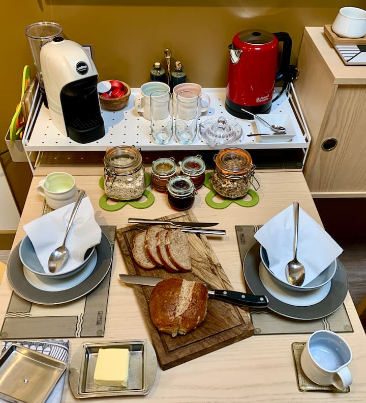 We offer a selection of complimentary home made breakfast foods such as granola, breads and preserves as well as a selection of teas, coffees and chocolate for our guests.