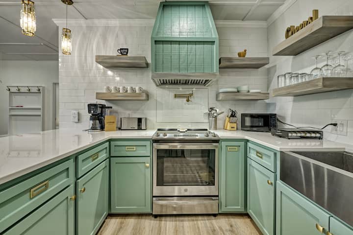 As you step inside, you're greeted by a bright, open space with tasteful décor that invites relaxation. The living room features comfortable seating, an electric fireplace for those cozy evenings, and a flat-screen TV for your entertainment. The newly renovated kitchen, located just off the living area, boasts modern stainless steel appliances, a wide variety of small appliances, and is fully stocked for all your culinary needs. The breakfast bar comfortably seats three, and tucked away is a hidden closet with a front-loading washer and dryer for your convenience.