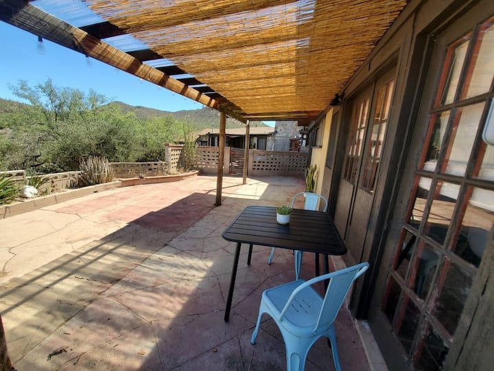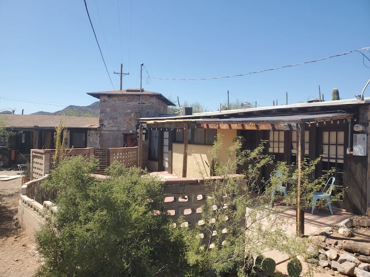 There are two bedrooms, both beds are queen size to allow for the cozy space. You will find the quaint kitchen stocked with all your essentials: coffee pot, large fridge, toaster oven, utensils, induction stove and pots and pans. Relax in the private porch with your morning coffee and/or sit outside at sunset to see the beautiful mountain lines, saguaros and be amazed to be visited by some wildlife. This is a desert ranch, so there are some desert-aware instructions your hosts will provide when you arrive! Come stay and enjoy our unique accommodations!