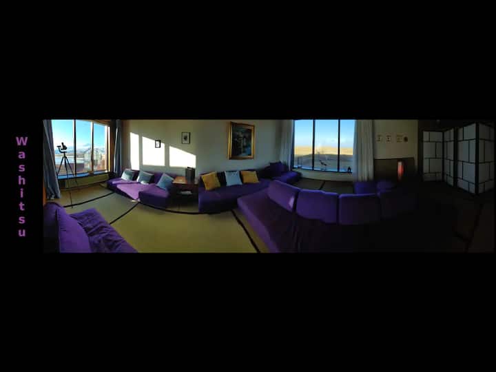 A tatami room is called Washitsu in Japan. Given the Mt Fuji lookalike scenery, we thought it would be appropriate to make this kind of dual use, Japanese style room. We made this room with our very own style so one could say it is a Nordic / Scandinavian adaptation of the tatami room concept. We covered the entire living room with the Tatamis that we specially ordered (the stores in Iceland did not even know what a Tatami is) directly ourselves from Asia and shipped with what used to be the largest container ship in the world. But instead of getting the cheapest Tatamis we got a premium type with an interior made of linen and coconut shells (about 20 000 of them) - the kind of stuff that is normally used for the interior of futons. This makes it very comfortable to walk on and even sleep on with an extra topper. Has the feel but not the look of a fitness room. Then we adapted and created low sofas and chairs. Not the typical uncomfortable ones but really comfortable and flexible ones, with movable backs and wide enough to sit on both sides to enjoy the Mt-Fuji like view in one direction and the midnight sun distant Artic Ocean view in the other direction. Which also gives the possibility of watching out for the Northern Lights on both sides of the house, in winter or anytime it gets dark. For a house in a village it is very unusual to have unrestricted nature views both in front and back of the house, so enjoy it. The sofas make up an ultra modern comfortable living space, where you can sit how you like, with bent legs, stretched legs, crossed legs and as close or as far as you like from other people you may be sharing the area with. To add to the atmosphere, we decorated the place with Japanese Shoji-style Ando lamps with premium paper but instead of just having the traditional white light, you can choose and dim the colors with a remote control. To give those that are sleeping there a bit more privacy, we provide moveable Shoji-style tall paravents.