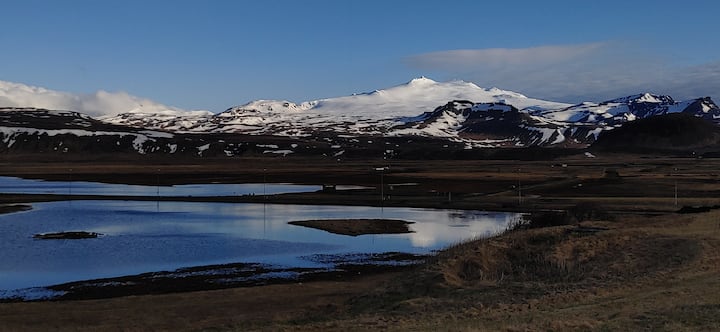 Snaefellsjokull, the Mt. Fuji lookalike volcano and glacier, is often referred to as being a mythical power source. This volcano’s last eruption occurred 2200 years ago. Snaefellsjokull was featured in the epic novel "Journey to the Center of the Earth" by Jules Verne. What makes our viewpoint of the volcano more spectacular is that from our angle, you can see the outlines of the caldera. The lakes in front of the house, the little islands and the distant waterfalls add to the magic. The National Park’s raison d’etre is this volcano mountain, that is referred to as the king of Icelandic mountains whereas some people like to refer to it as one of the 7 mystical power centers of Planet Earth. The National Park whose size is over 180 km2 has other things of interest: caves, abandoned settlements - including the oldest fishing artifacts found in any of the Nordic countries; lighthouses, bird-cliffs, strange rock formations, a drive-in volcano, rich geological environment, rocky beaches and black and white sand beaches.