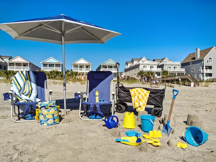 We supply beach towels, bath towels and linens for free. There are beach chairs at the house for our guests to use as well. All of the bathrooms will have toilet paper and the kitchen will have paper towels upon arrival.