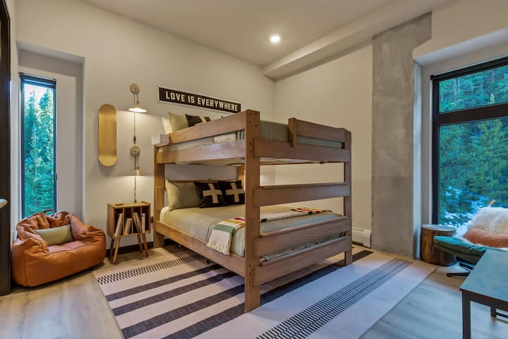 The condo was designed to be playful and eclectic while also being upscale and comfortable for your family or group. The aesthetic gives feelings of retro cabin or camp vibes. It is set against a beautiful backdrop of giant pine trees visible through the floor-to-ceiling windows. Corridor Slope is just below the patio for watching skiers and boarders fly by.