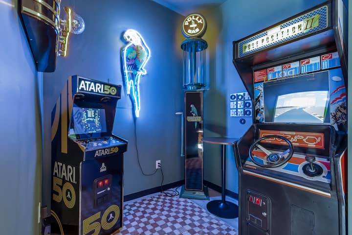 The Arcade features two retro Atari machines, one that features 50 old-school games and one VERY retro racing machine. The decor features many vintage Polly gas machines and neon signs. Also included is a cocktail table, disco ball, and magnetic tic-tac-toe.