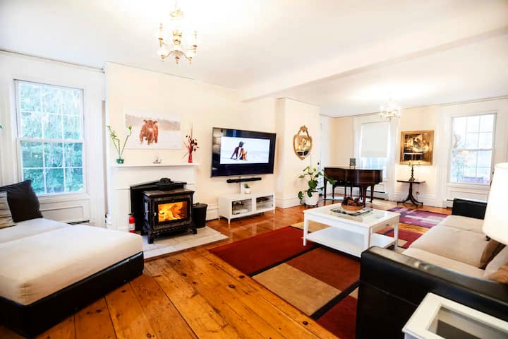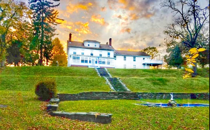 Relax & create lifelong memories at our 7,000 sq ft historic farmhouse mansion. Built 1859, Orchard Hill Estate offers countless amenities; fantastic hot tub, fire pit, table tennis, wood-burning stove, baby grand piano, & much more on secluded acres w/ beautiful sunrises, glorious sunsets over forested mountains. Countless stars at night. Hi-speed mesh Wi-Fi. Orchard Hill is the perfect blend of old-world charm & the latest technology. Near West Point, Under 1 hour from NYC, CT, PA, NJ.