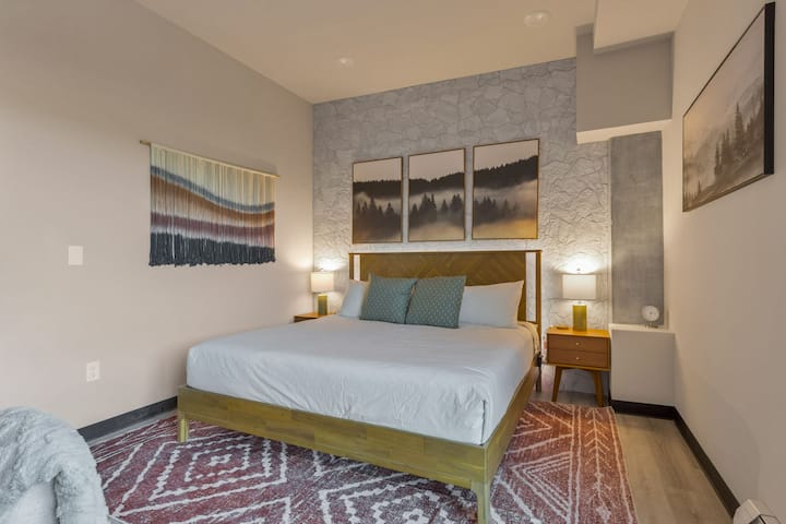 A great day in the mountains starts with a great sleep. The star of the primary bedroom ensuite is a king-size luxury mattress. The primary ensuite includes it's own lounge area, TV, kitchenette, workspace, and bathroom with luxury finishes.