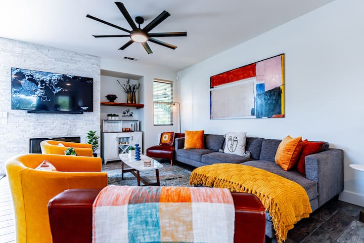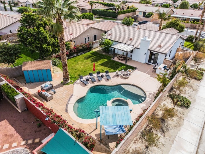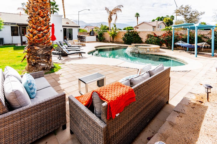 ‘Desert Moon‘ is a resort style, contemporary desert vibes Boho-Chic home designed décor consisting of 4-bedrooms, 2-bathrooms, a giant private salt water pool (33ft long by 13ft wide and about 5.5ft at deepest point) including a baja-shelf seating area and umbrella along with spa jacuzzi (optional guest paid pool and/or spa heating available...see below for rates), large backyard entertainment area secluded in secure walled yard with privacy gate which features BBQ grill island with four bar tools, plenty of lounge chairs, gas operated fire pit, hammock, and more fabulously fun amenities! Backyard also has perimeter yard lighting, a lemon tree, overhead atmospheric dangling lights, pool toys/floaties, and inside the water pool/spa lights night swims or relaxing. Kitchen features everything you need for the cook in you. Property is in a safe and secure Indio community with very nice neighbors, immaculate landscaping, and an abundance of magnificent sunrise/sunset views.