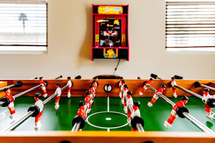 Welcome to ‘Desert Moon’, the stylish 4bd/2ba vacation home with stunning pool/spa area residing on a private corner lot in a quiet Indio neighborhood. Includes private pebble-tec saltwater pool and spa (heating optional) nestled in a big backyard which features a large grass area, BBQ island, relaxing hammock, plenty of lounge chairs, and firepit for first class entertaining. Ms. Pac Man and Foosball fun game room. Located close to many area attractions including Empire Polo for music fests.