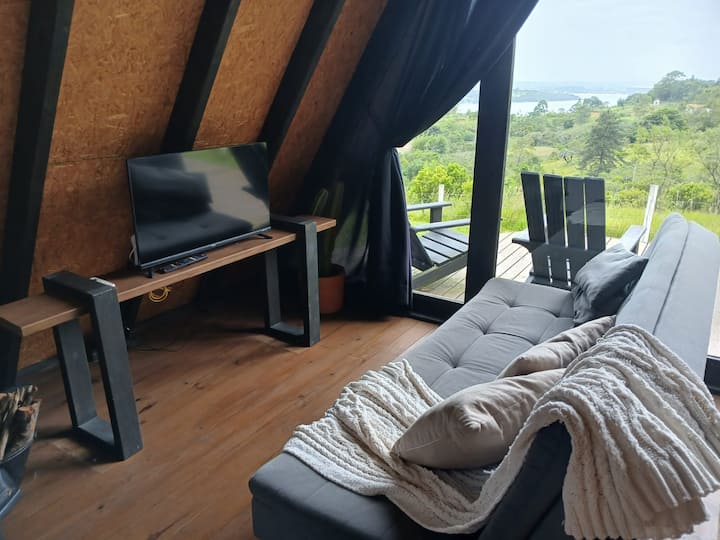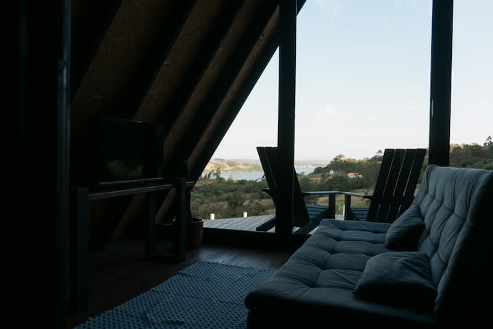 Chalé Luz has a panoramic view of the Lagoa, and several mountains throughout the Chalé, a fantastic Deck with two comfortable armchairs and a support table, which connects you to nature and an extraordinary landscape where you will enjoy, in addition to the splendid and wonderful views, a delicious glass of wine, sunset, a cup of coffee at sunrise, a delicious fireplace in our floor fireplace made of rustic stone accompanied by a meal made on the main grill, enjoying a beer, and a network that gives you the feeling of belonging to all this atmosphere. I can't forget to mention the chants of the free birds that fly everywhere and of course the beautiful horses that sometimes present us with their presence right in front of the chalets.