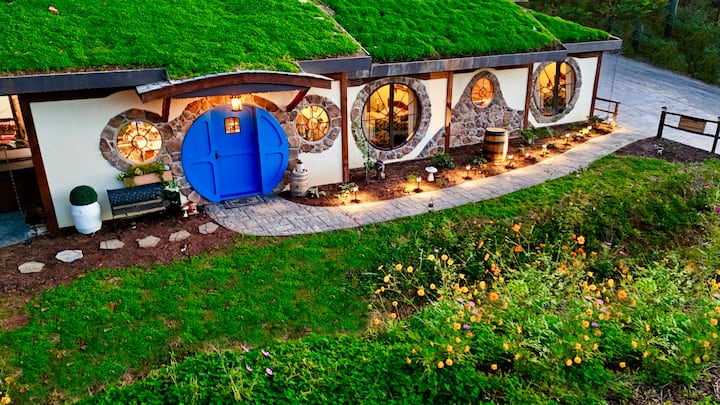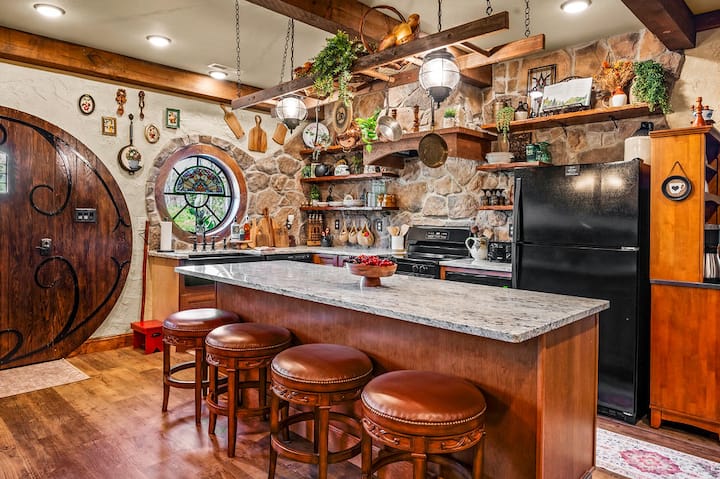 This one-of-a-kind Hobbit-style earth home blends handcrafted details, rustic luxury, and immersive fantasy—designed to feel like a giant, cozy hug the moment you arrive.