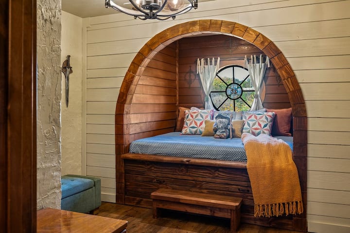 Prepare to be amazed as you enter the second bedroom and find your queen size bed built seamlessly into its own little world you may enter through the circular arch. Complete with a charming circular window that lets in just the right amount of light. Imagine waking up to the soft glow and feeling like you’ve stepped straight out of a tale. For extra guests, or for a little extra adventure, a twin trundle bed is tucked seamlessly away, ready to be pulled out for comfortable slumber. For the tiniest of halflings or for the funniest of adults the room is equipped with cloaks to enhance your stay and invoke your creativity. This room also features its own bathroom directly across the hallway with a shower tub combo.