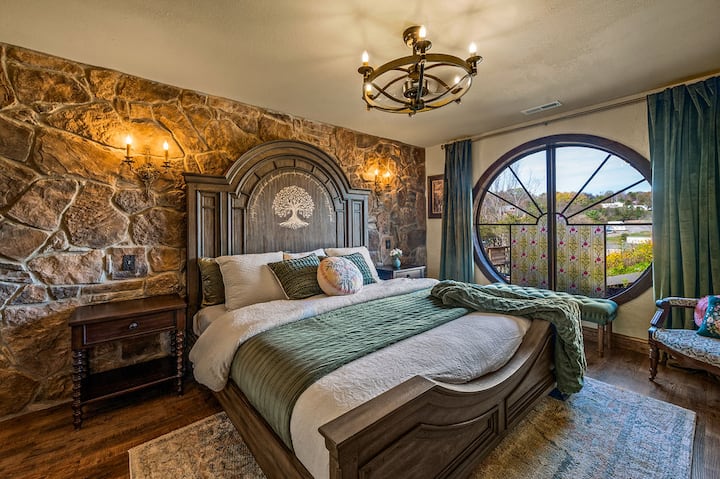 Step into the main bedroom and you will immediately be taken with the giant wooden bed. Sink into the embrace of a king sized beautifully arched wooden bed adorned with the intricate carvings that depict the Tree of Life and elegant script for you to encode. The stone wall behind the bed creates a sense of warmth while the fireplace promises cozy nights filled with stories and dreams. A large 6ft stained glass window with luxurious velvet window coverings allows you to control the light and create the perfect ambiance for relaxation or a romantic evening. This room has an attached walk in shower with double stone sinks.