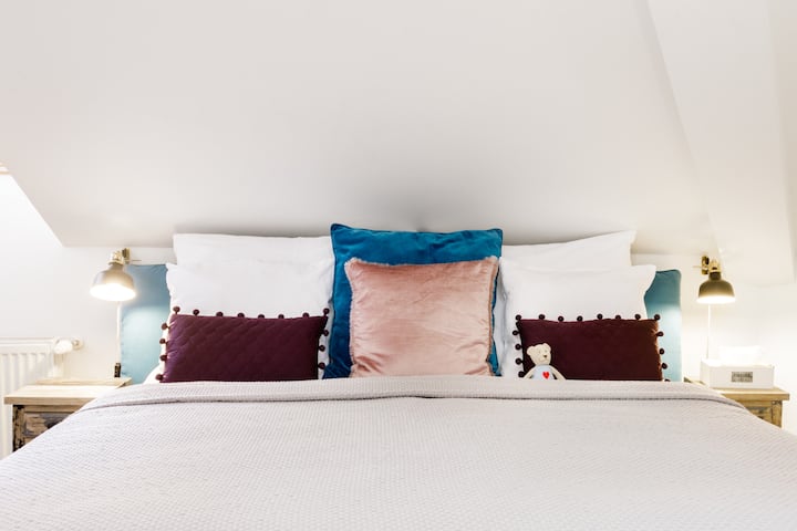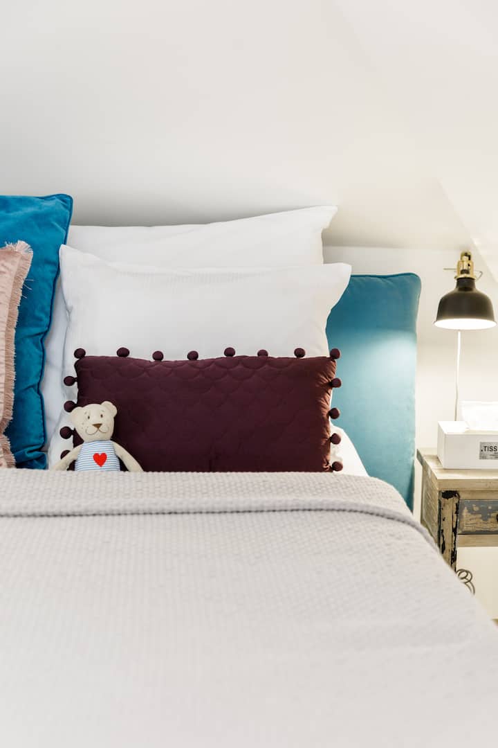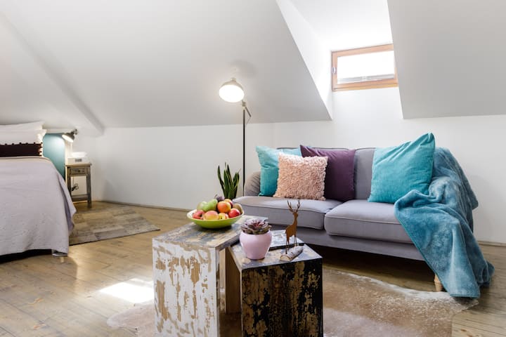 Located in the attic of a historical 18th century journeyman's' hostal our romantic apartment is approximately 40 sqm large with a seating area, large king size bed, kitchenette and bathroom with shower.