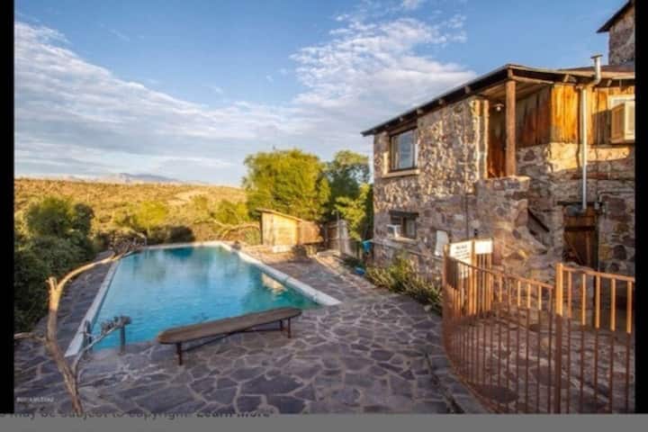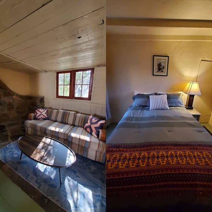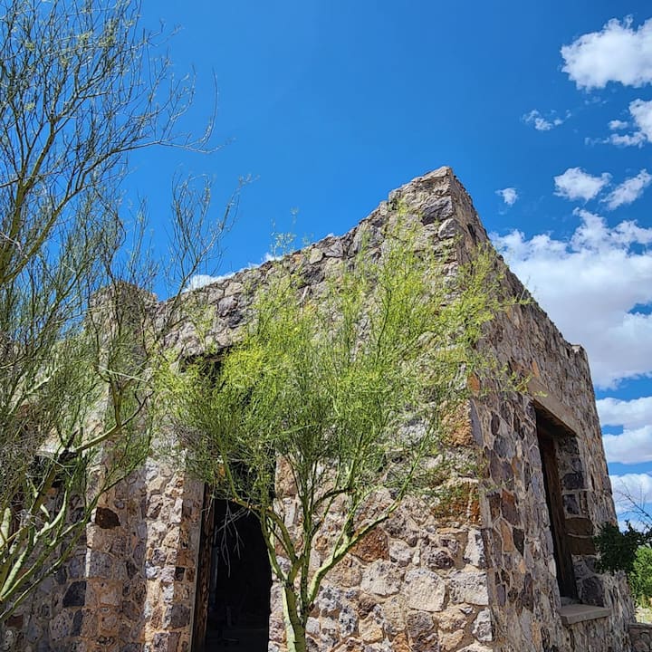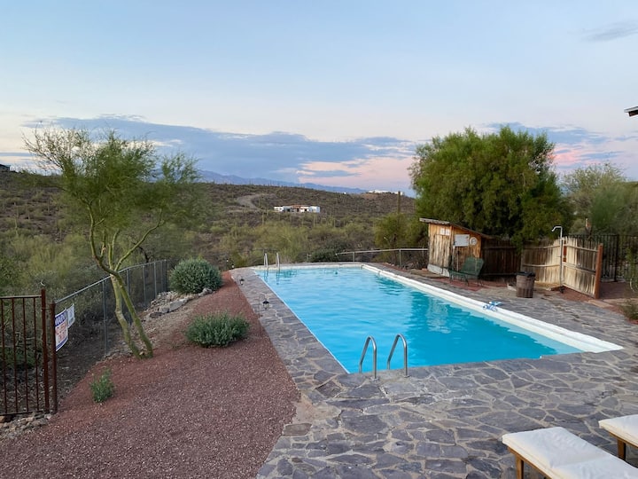 A comfortable studio with a queen size bed to allow for the cozy space. You will find the quaint kitchen stocked with all your essentials: coffee pot, a small fridge, utensils, full stove with an oven, and pots and pans. Relax outside with your morning coffee and/or sit outside at sunset to see the beautiful mountain lines, saguaros and be amazed to be visited by some wildlife. This is a desert ranch, so there are some desert-aware instructions your hosts will provide when you arrive! Come stay and enjoy our unique accommodations!
