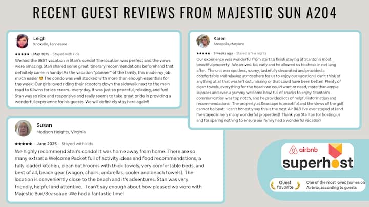 ✹ My reviews across all my properties support that my #1 goal is delivering an awesome beach vacation for my guests. This starts with a sparkling clean property and fast, excellent customer service. If you need anything at all, or if something is not right, I am quick to respond! I’ve tried to think of everything that my family and my guests would want in a beach rental. Vacation rentals are my passion, and I am always trying to improve the guest experience, so suggestions are welcome!