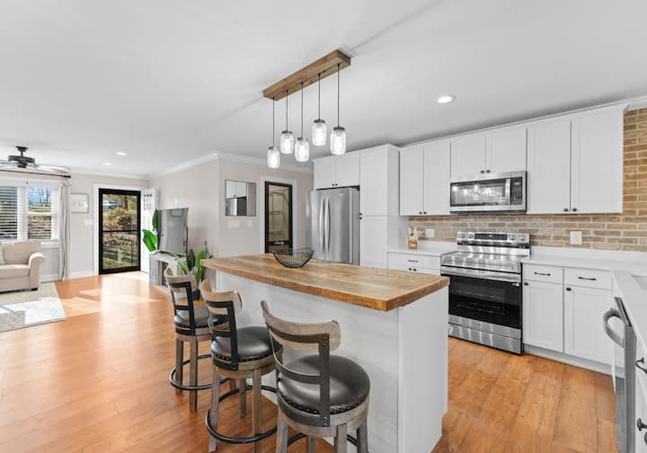 - **Kitchen**: Fully stocked with brand-new appliances, the kitchen is a dream for meal prep. Whether you're cooking up a feast or making a quick snack, the island with seating for three ensures the chef isn't lonely.