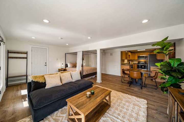 The first-floor studio offers everything you need for a relaxing and convenient stay. The kitchen allows you to prepare everything from quick snacks to full meals. Enjoy the plush queen-sized bed for restful sleep, a dining table, and a sitting area perfect for unwinding. The Roku-enabled TV provides entertainment, and the full bathroom ensures your comfort and privacy throughout your stay.