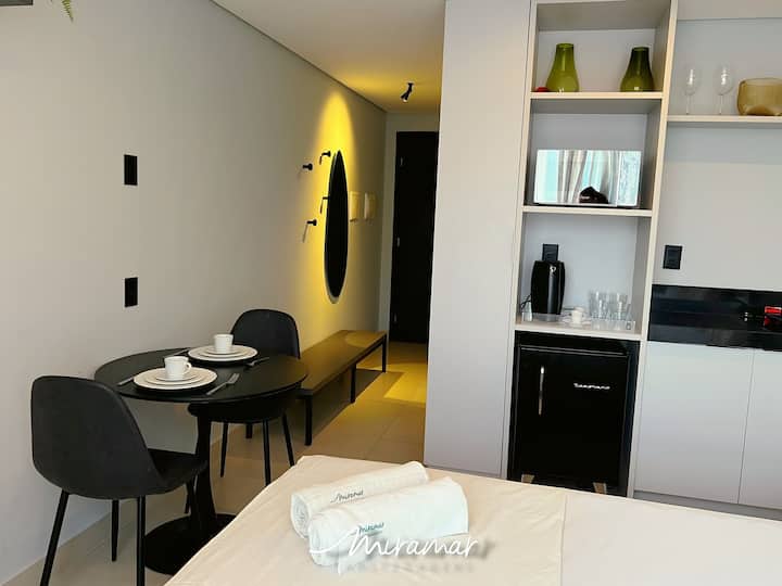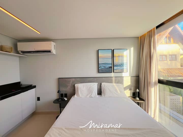 Enjoy a charming and sophisticated setting on the Foot in the Areia Alta Garden! This charming, air-conditioned air-conditioned flat, offers a super comfortable double bed, modern decor with LED details, and an ideal table for your meals, or to have a wine for two. The smart TV guarantees moments of leisure, all with the touch of luxury and sophistication you deserve. Perfect for up to two guests, it's the ideal place to relax and feel at home. Come live this unique experience!